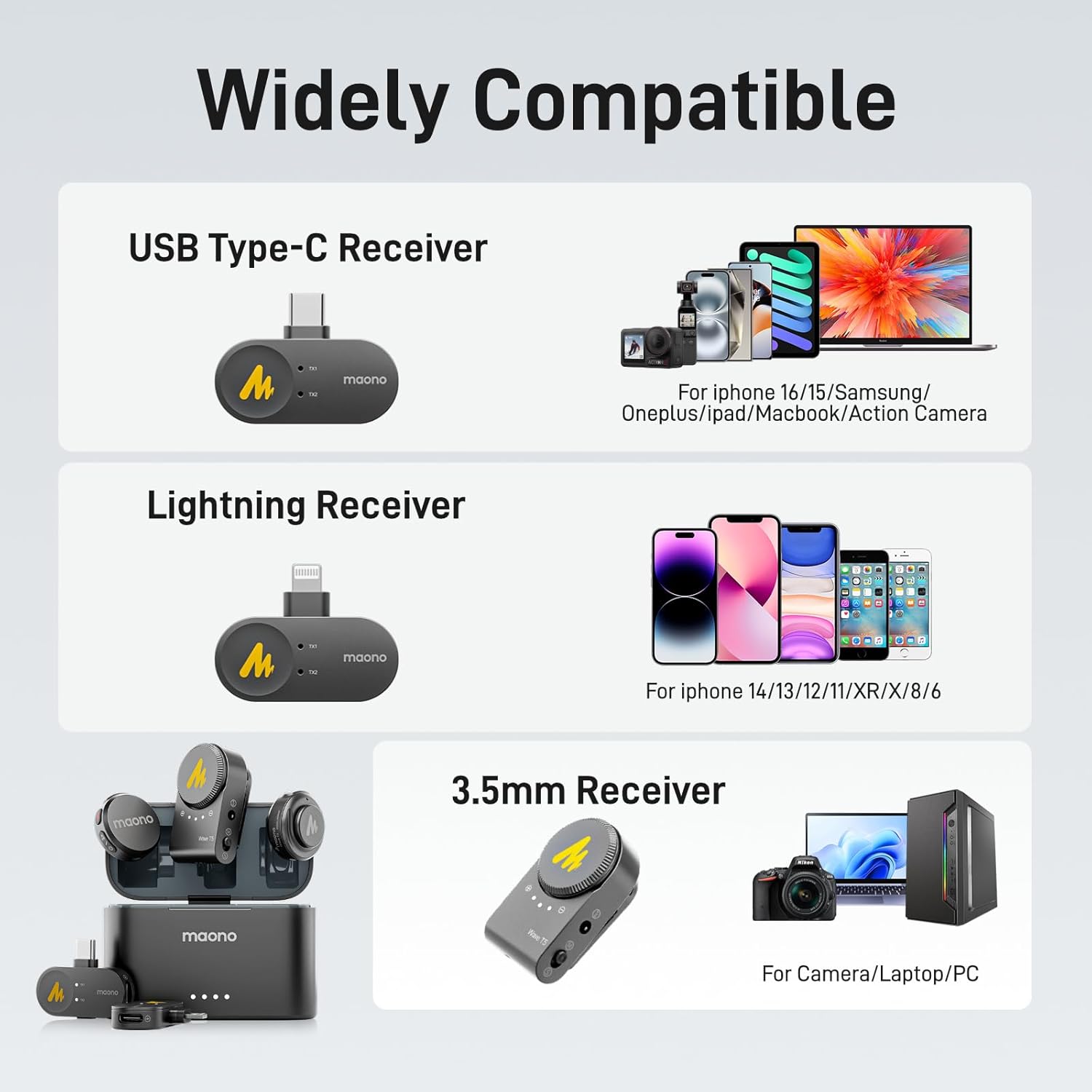 For professional video creators, the camera receiver enables easy integration with DSLR and mirrorless cameras. This multi-device support makes the Maono Wave T5 PA3 a single microphone solution for all your recording needs.